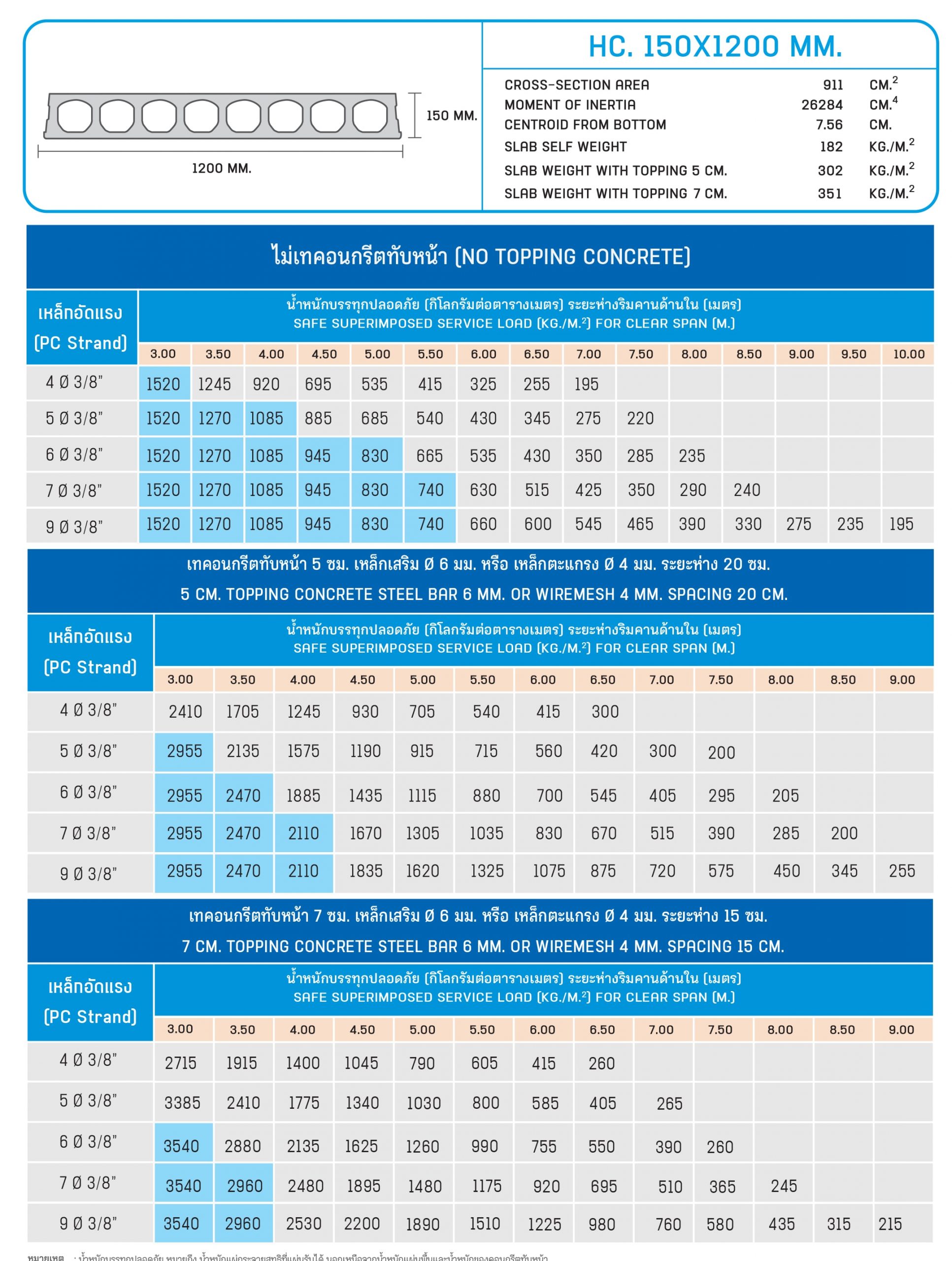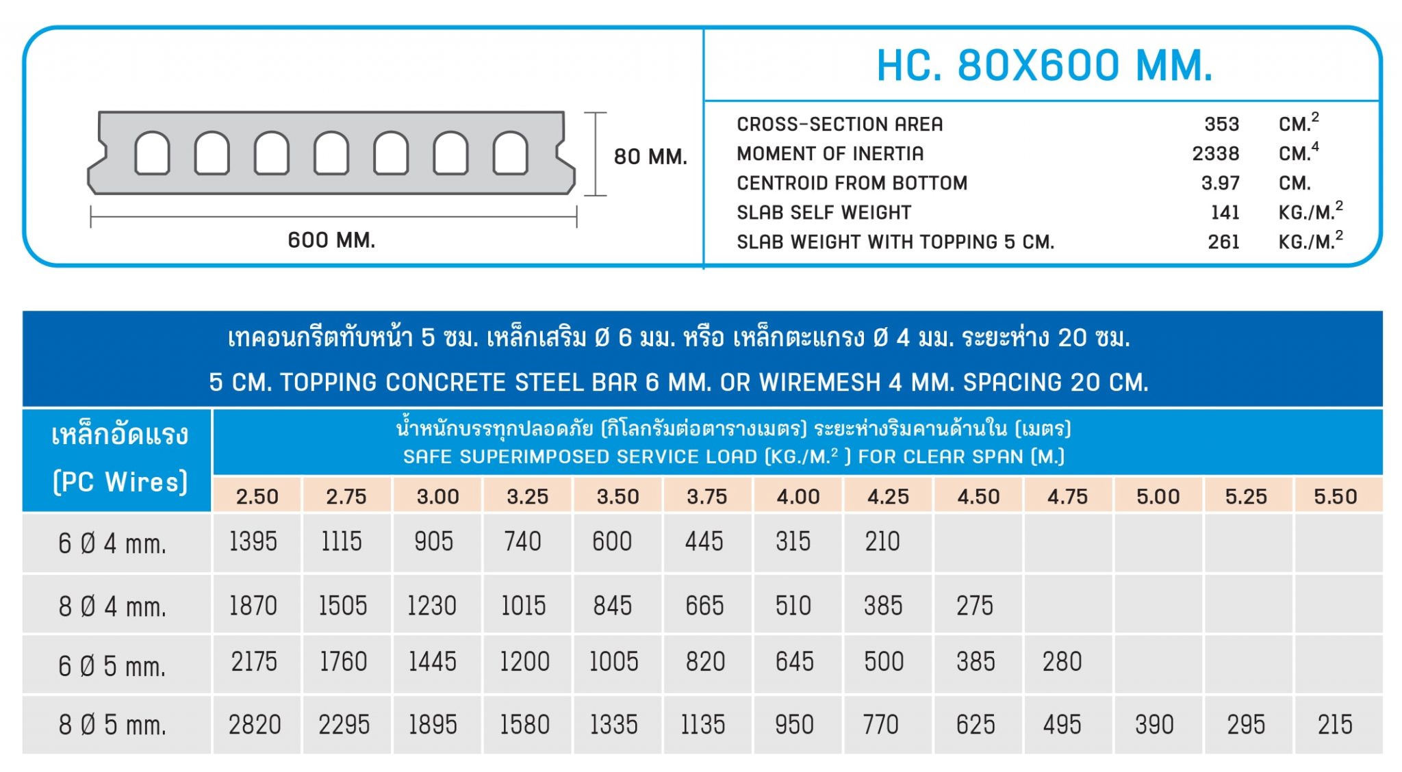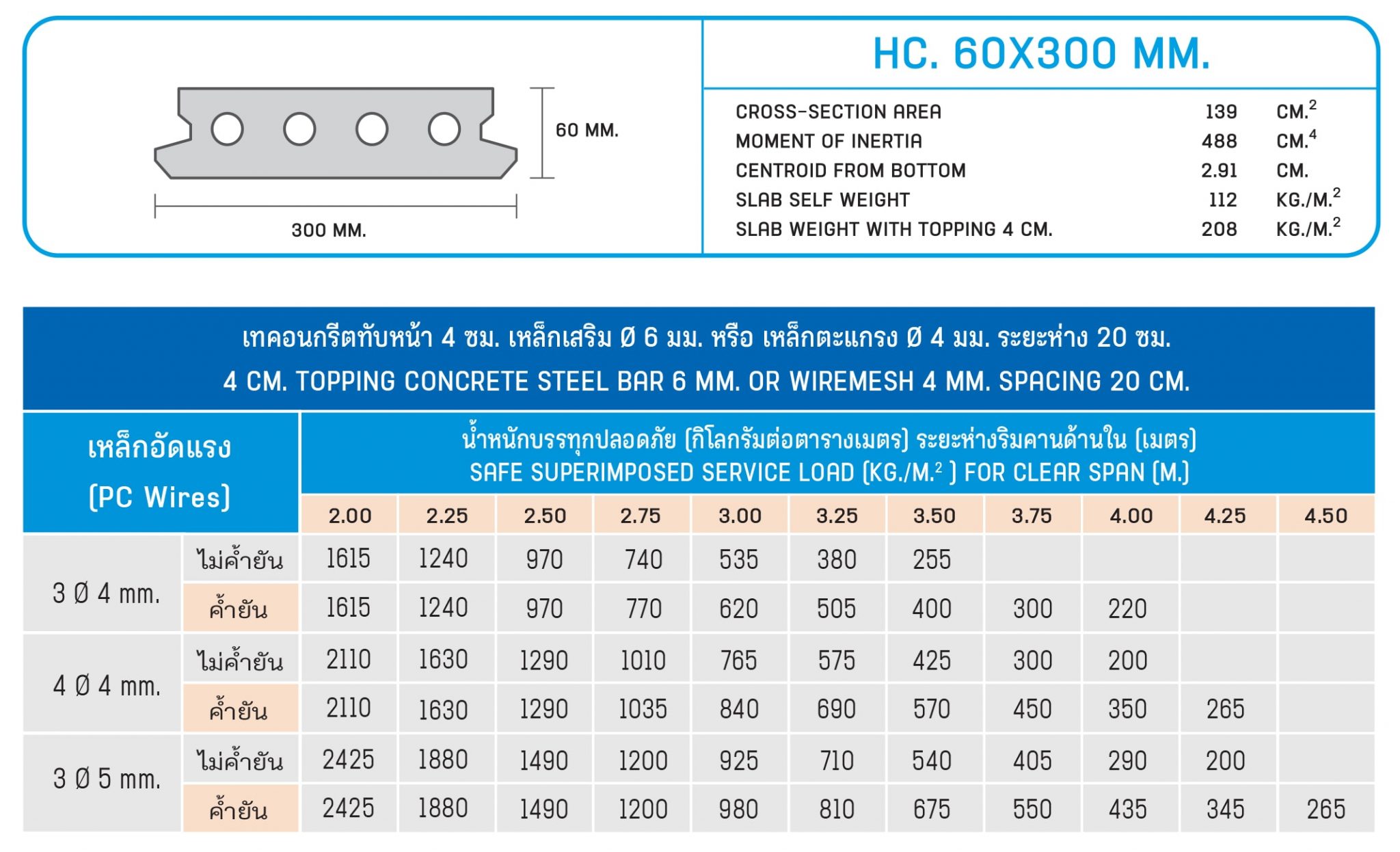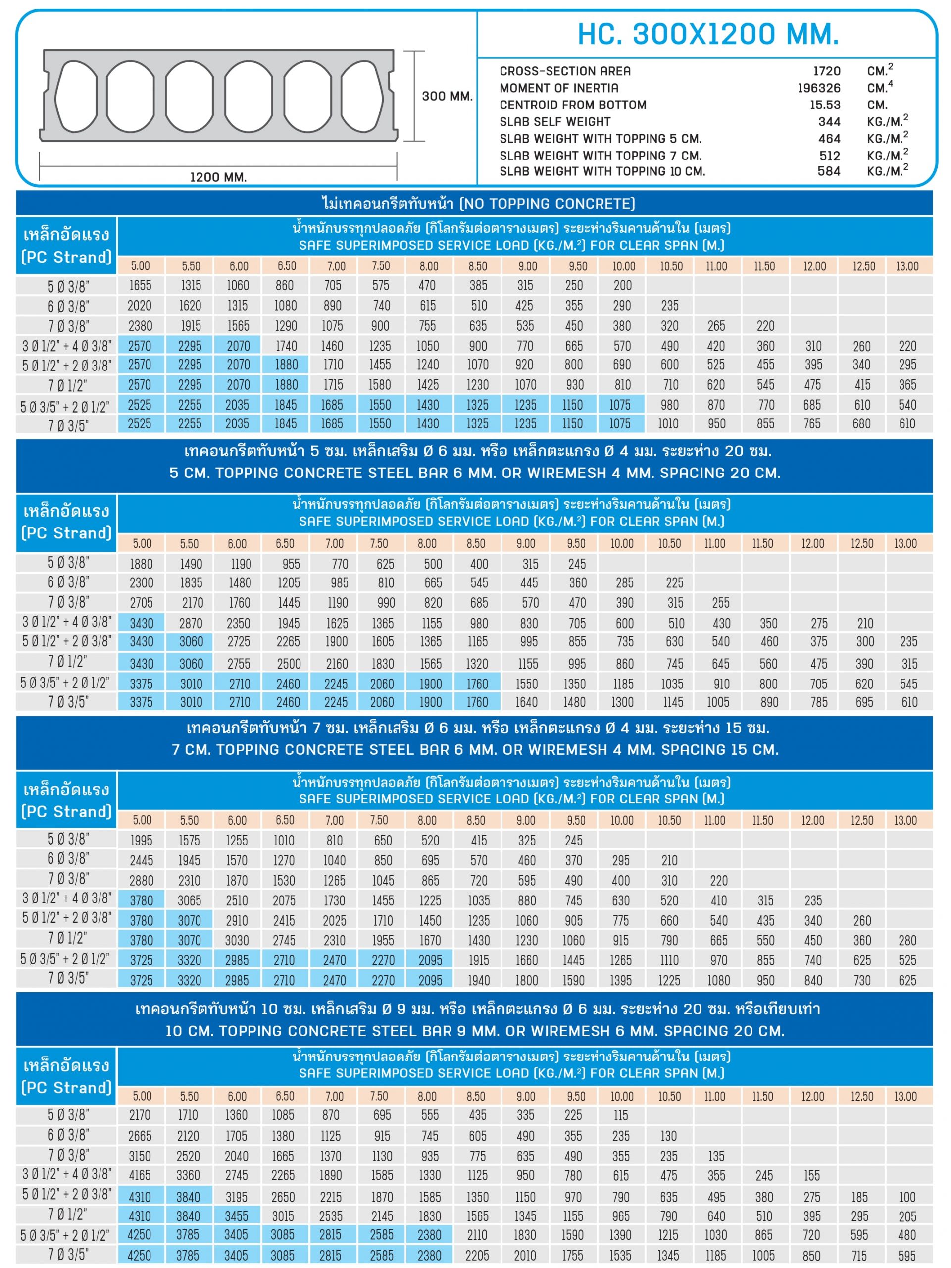 6. เป็นแผ่นพื้นสำเร็จรูปชนิดรูกลวง เสริมด้วยลวดเหล็กอัดแรงมาตรฐาน ASTM ใช้เป็นโครงสร้างพื้นอาคารทั่วไป มีน้ำหนักเบาเมื่อเทียบกับแผ่นพื้นอื่นๆ